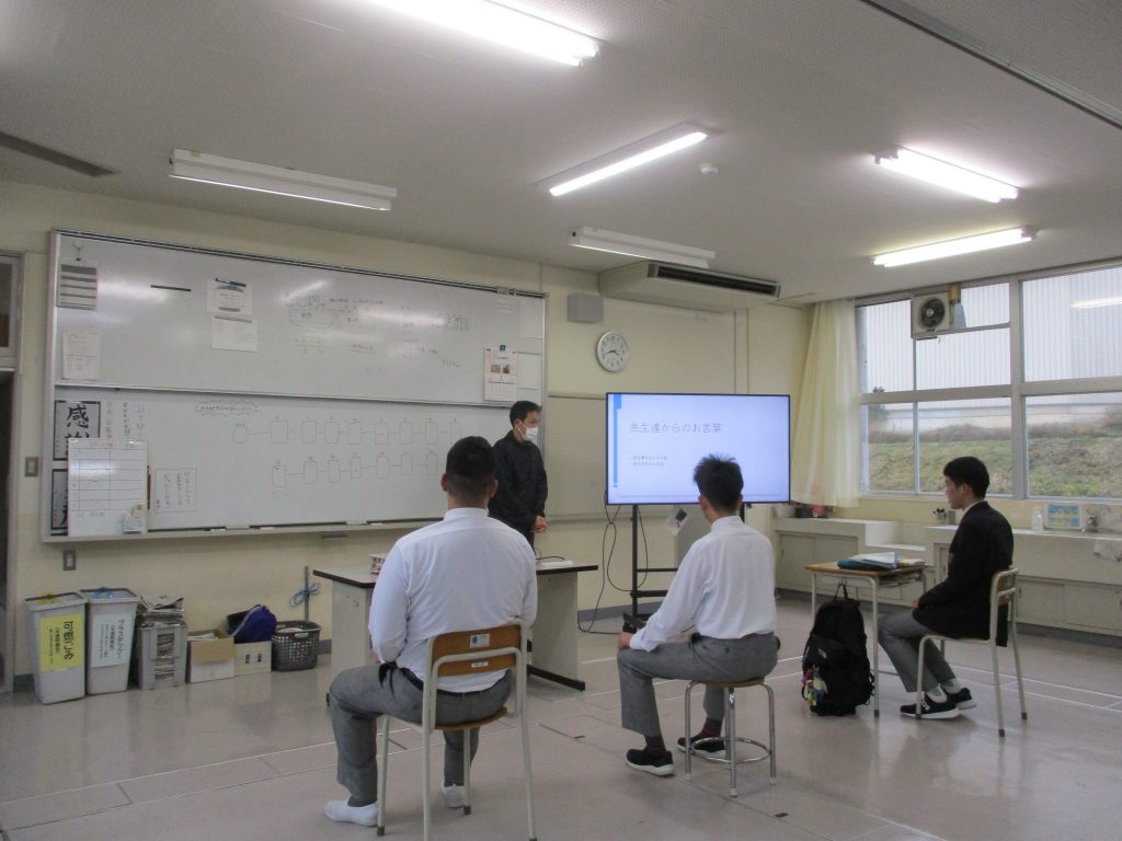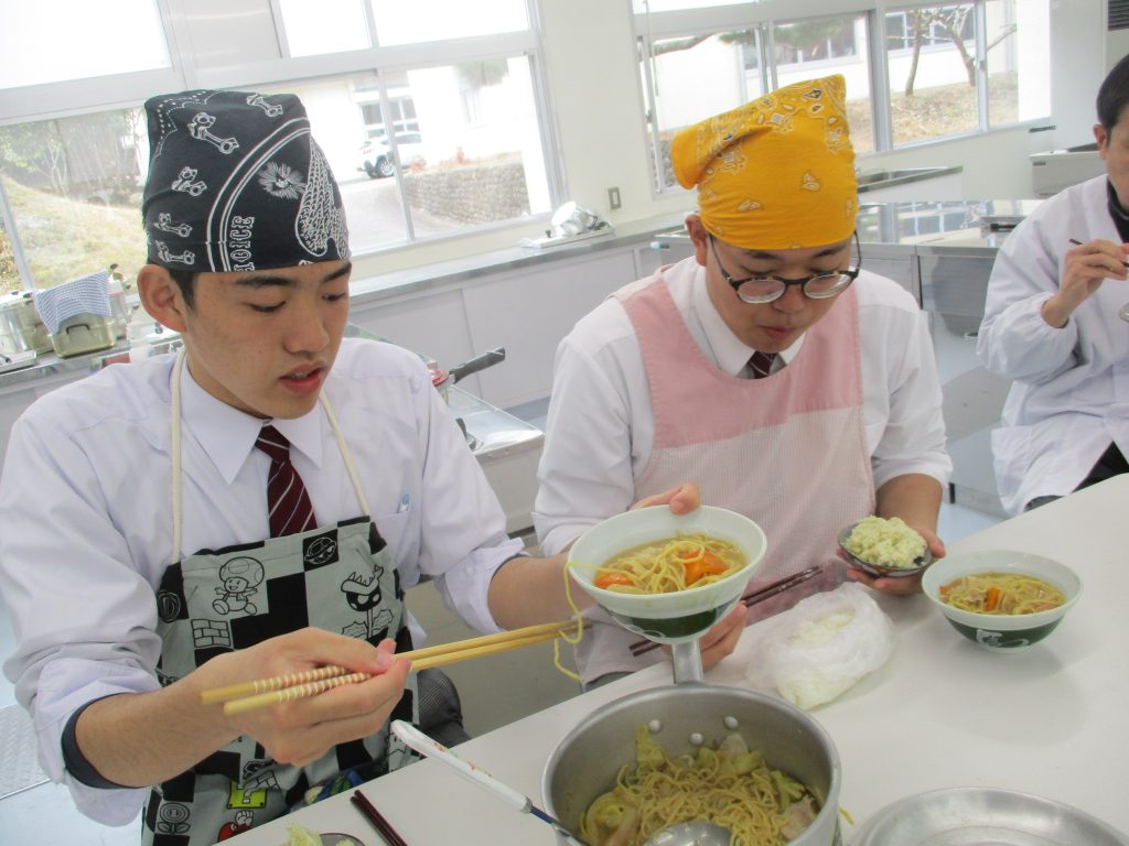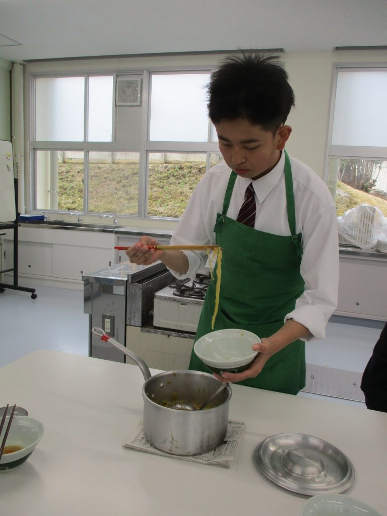 2月27日 卒業を祝う会を行いました。午前中は、卒業をお祝いする会食を行いました。自分たちでスーパーへ出かけて食材を購入、3人で協力して取り組む最後の調理実習でした。 メニューは、ボリュームたっぷりの「鍋ラーメンごはん、ポテトサラダ」。一番人気の鍋ラーメンは、何度もおかわりをするほど大好評で、みんなで囲む食卓ではなかなかの「食いっぷり」を披露してくれました。