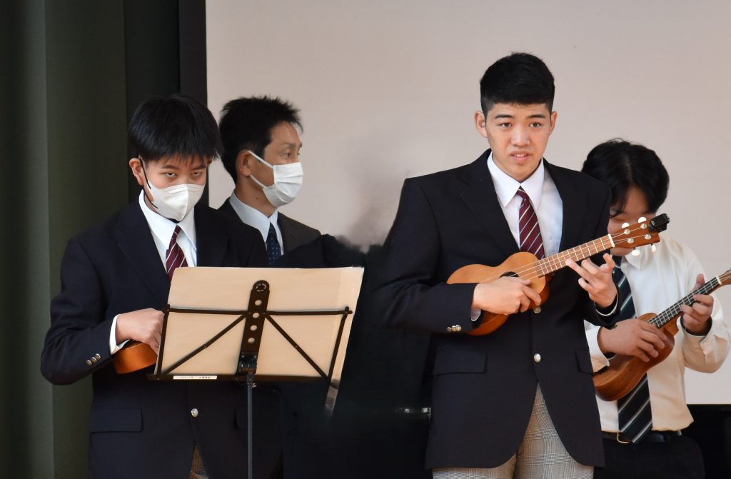 舞台発表では、田口高等学校音楽選択の1年生とウクレレ演奏と合唱の音楽発表をしました。授業交流での練習の成果を発揮しました。