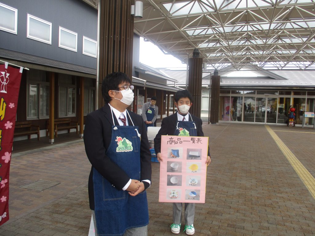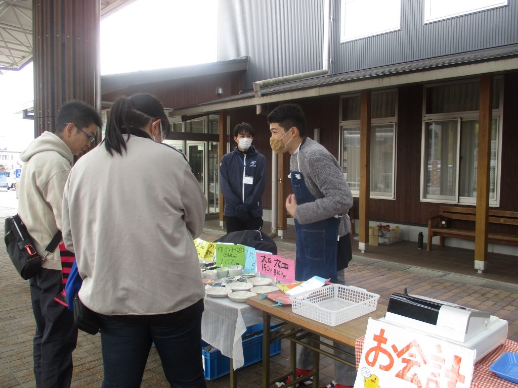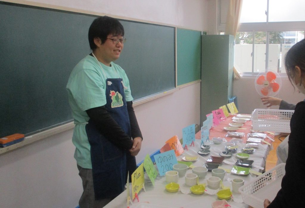 設楽町役場で窯業製品の販売をしました。地域の方や役場の方が「いらっしゃいませ」の呼びかけに集まり、商品を見てくださいました。中には、「文化祭で買えなかったから来ました」と購入を楽しみにしてくださった方もいらっしゃいました。お客様に「これは自分たちで作ったの?」と聞かれる場面もあり、生徒たちは対話を楽しみながら販売することができました。
